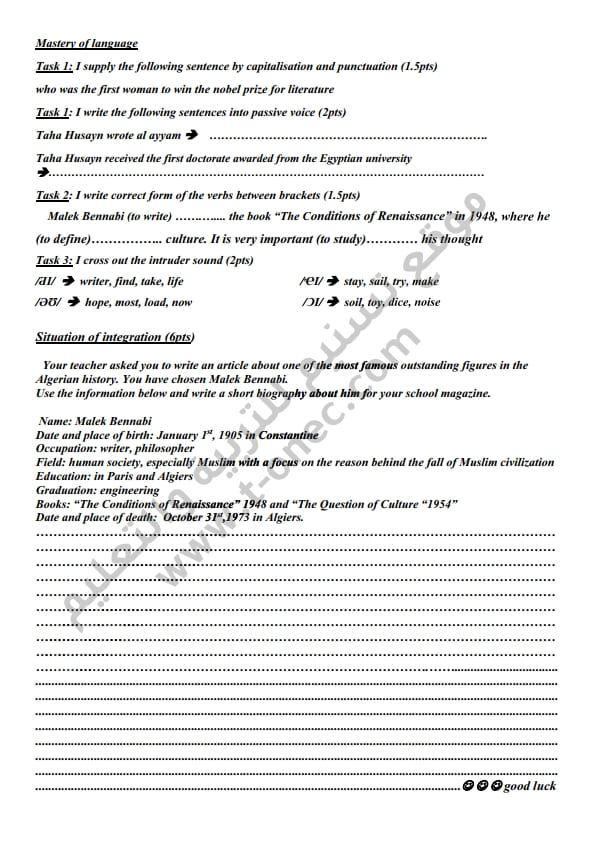 مواضيع وحلول شهادة التعليم المتوسط